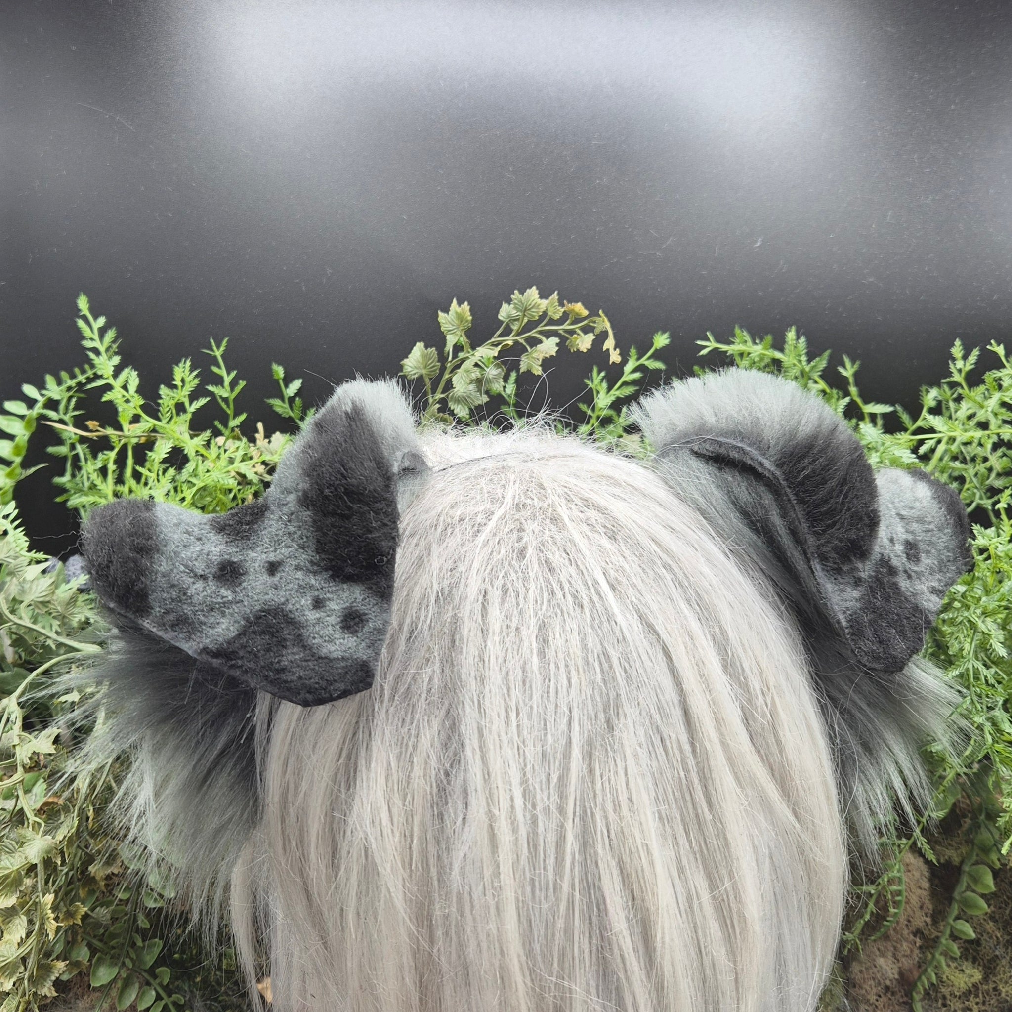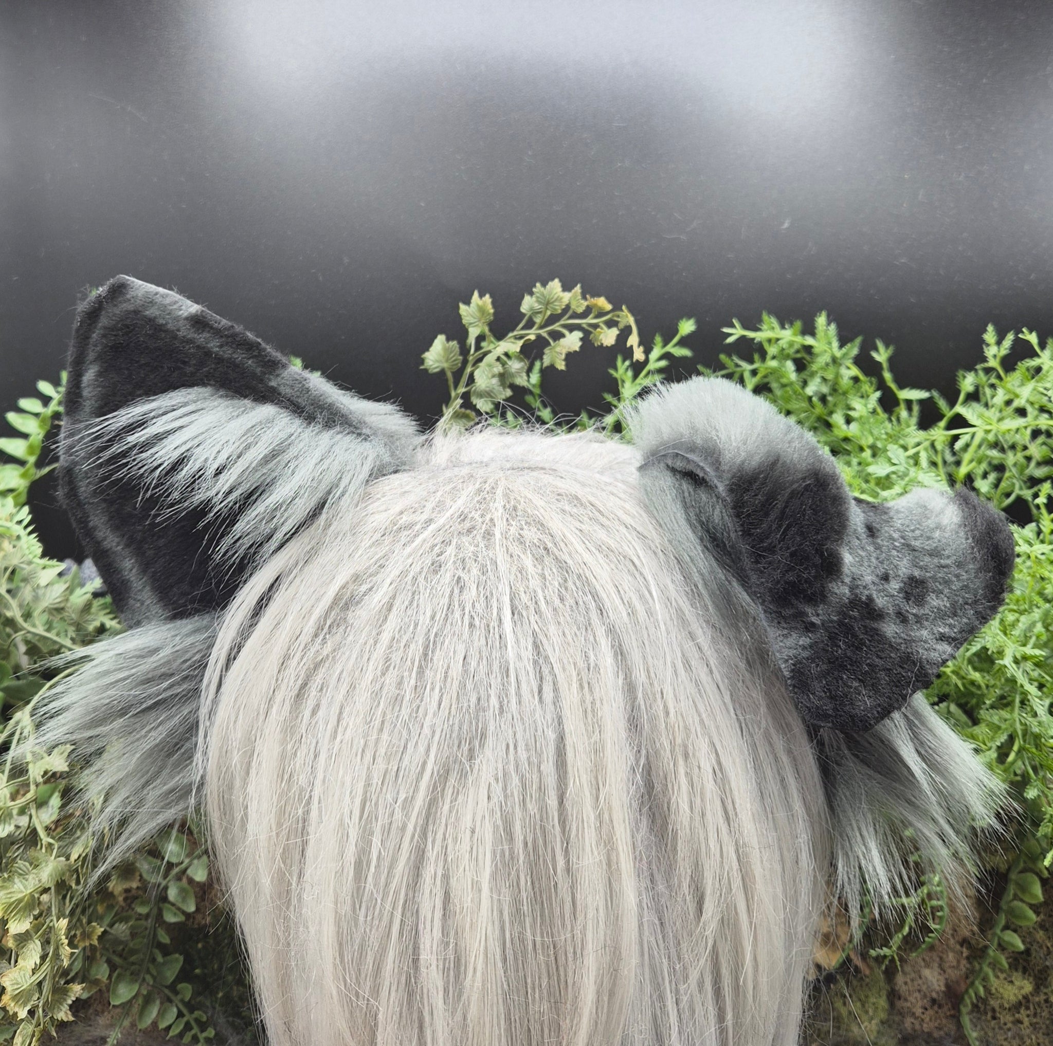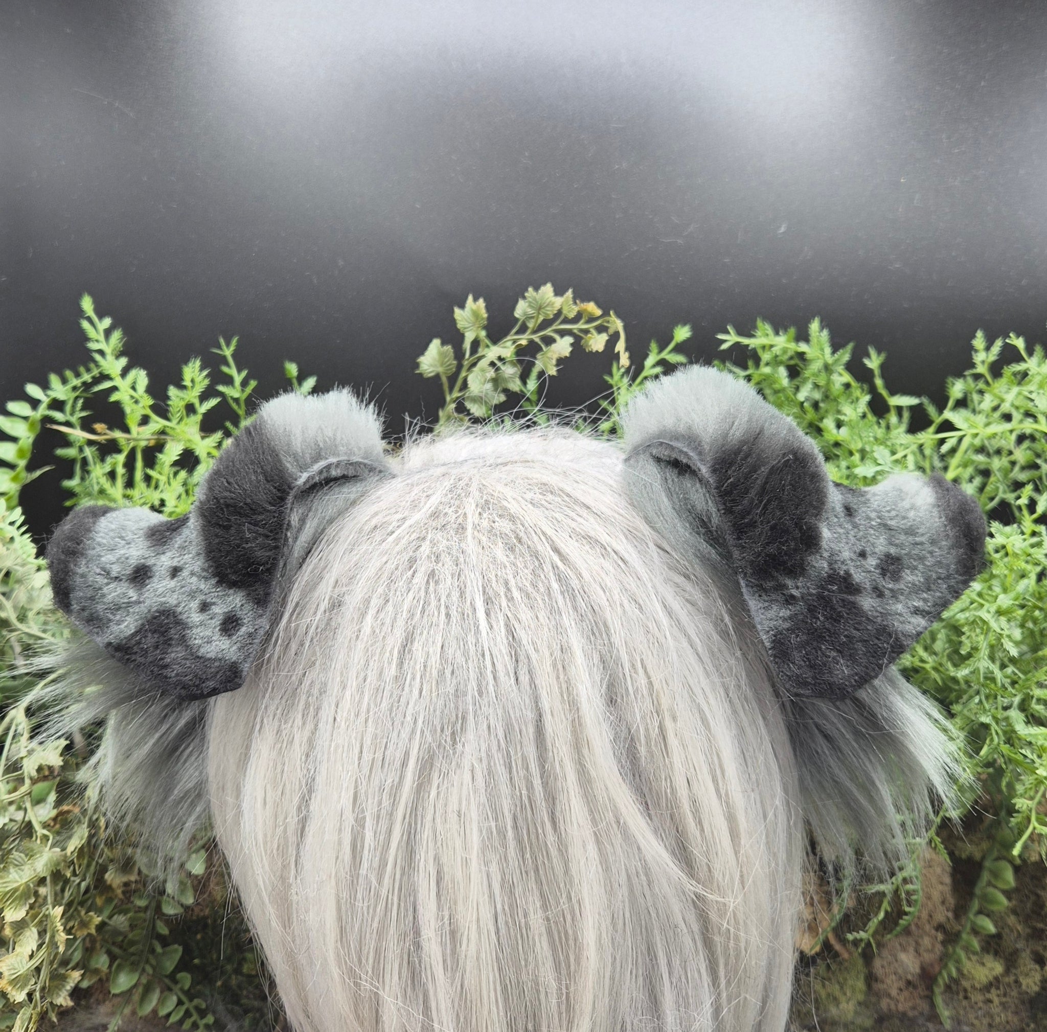 An adorable set of carefully sculpted gray colored puppy ears with black spotting! These can be flopped over, one flopped or one upright or both upright! They're around 4in fully upright, fully wired and poseable and slide on the headband.